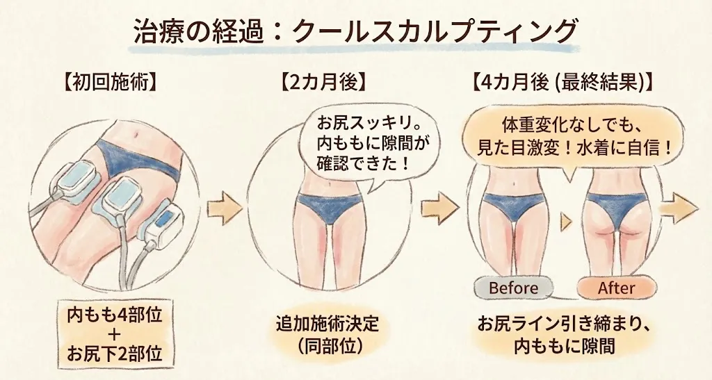 患者様のご様子: 夏に予定されている海外旅行で「これなら自信を持って水着を着れそうです!」と笑顔で喜ばれていました。