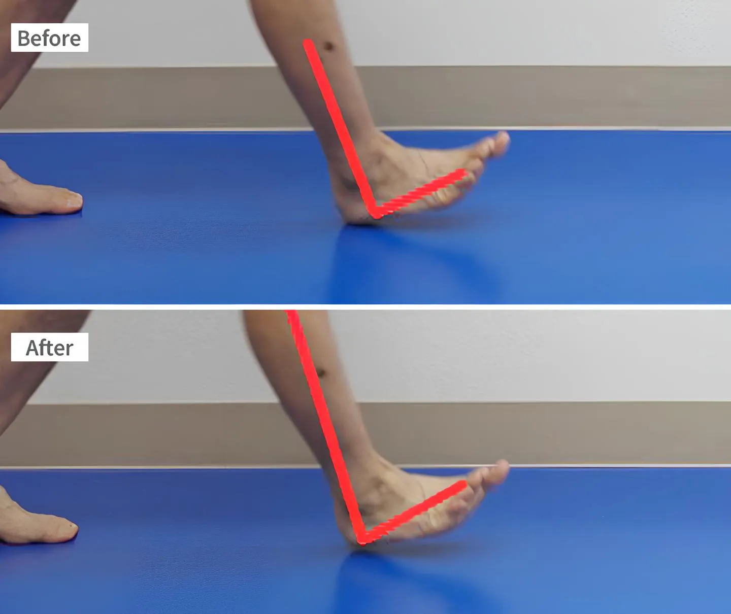 改善後: 足首の柔軟性とつま先を上げる筋肉が改善。つま先が高く上がるようになり、円滑な重心移動が可能になりました。